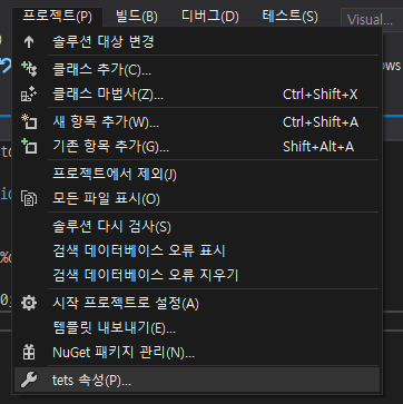 상단 [프로젝트 - 속성] 을 눌러 속성 창을 엽니다.
