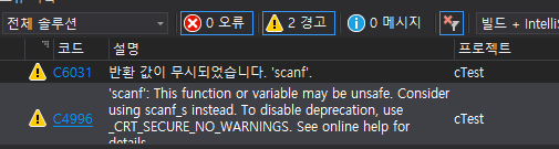 함수 scanf의 반환값을 어딘가에 대입하거나 사용하지 않아서 발생하는 경고입니다. 코드상 문제도 없으며, 단순히 버려지는 값이 있음을 알리기 위해 인텔리센스가 안내하는 내용입니다. 만일 원하는 작업대로 정상 동작 한다면 무시하셔도 됩니다.