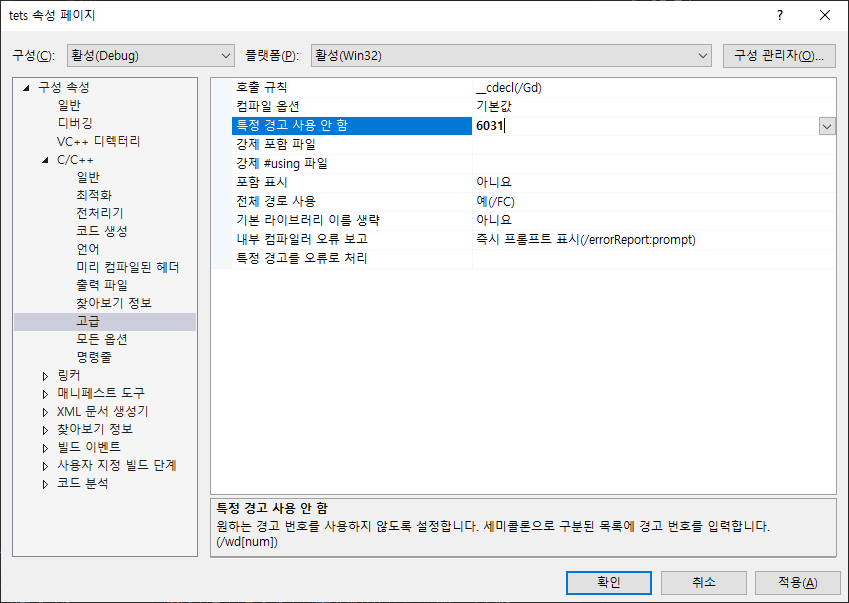[특정 경고 사용 안 함] 메뉴에 가리고자 하는 경고 번호를 입력하세요. 여기선 6031을 입력해주시면 됩니다.