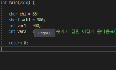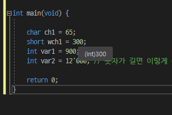 이 상수들의 타입은 무엇일가요? ch1은 char, wch1 = short, var1 = int, var2 = int입니다. 물론 변수는 그 타입을 알아보기가 쉽지만, 이들 {65, 300, 900, 12'000}의 타입은 무엇일까요? int입니다. 따로 접미어나 캐스팅을 진행하지 않았을 때 기본 타입은 int로 설정됩니다.