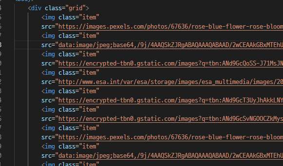 붉은 사각형으로 표시한 것과 같이 바로 아래 요소와의 간격이 정형화 되지 않습니다. 이 원인은 이미지 비율에 있습니다. width가 n인 이미지가 존재한다면 이 이미지의 height는 현재 CSS 기준으로 k * (grid-auto-rows) + (k-1) * (grid-gap); k = n / ( grid-gap + grid-auto-rows ) 인 크기어야합니다. 그런데 이 비율이 맞지 않으니 발생하는 문제인거죠. 따라서 이 이미지를 래핑해줍니다. 전 div.item으로 수정해주었습니다.