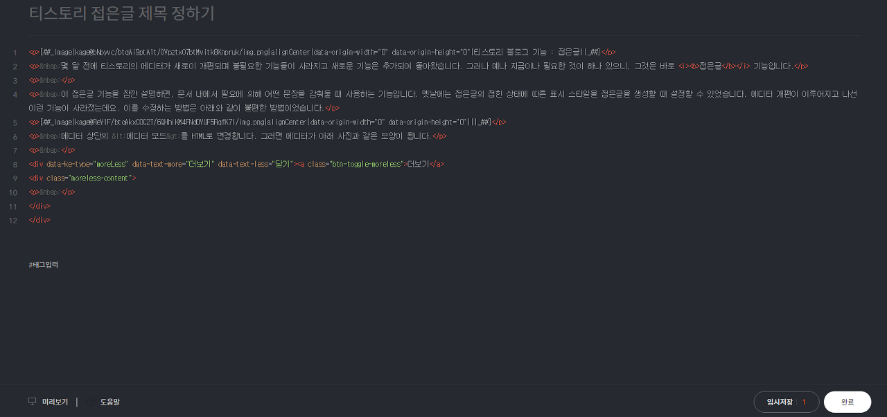 티스토리 접은글 제목 정하기 : 01 몇 달 전에 티스토리의 에디터가 새로이 개편되며 불필요한 기능들이 사라지고 새로운 기능은 추가되어 돌아왔습니다. 그러나 예나 지금이나 필요한 것이 하나 있으니, 그것은..