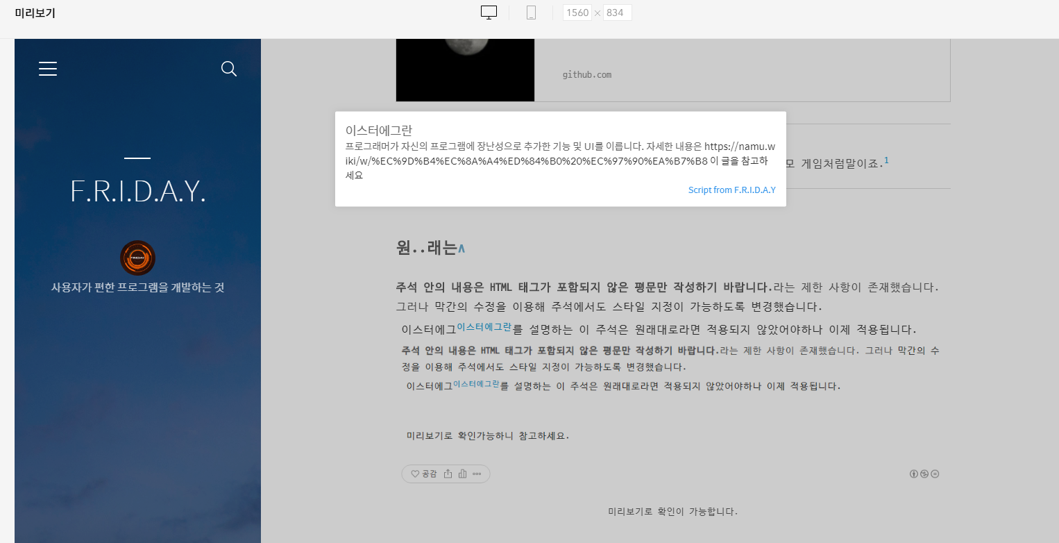각주 안의 내용은 HTML 태그가 포함되지 않은 평문만 작성하기 바랍니다.라는 제한 사항이 존재했습니다. 그러나 막간의 수정을 이용해 각주에서도 스타일 지정이 가능하도록 변경했습니다.