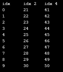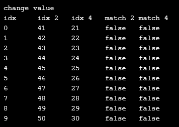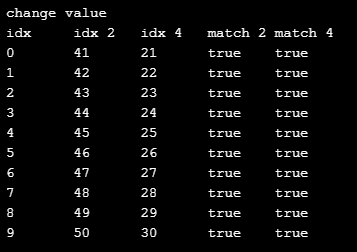 printf("idx\tidx 2\tidx 4\tmatch 2\tmatch 4\n");