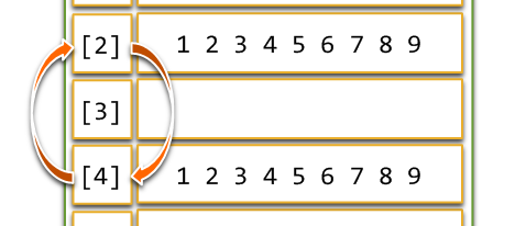 위와 같은 공간이 존재한다고 할 때, 정적 배열의 경우에는 2번 배열과 4번 배열의 값을 서로 변경할 때는 반복문을 통해 일일이 교환해주어야 합니다. 코드는 아래와 같습니다.
