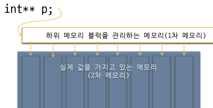 이렇게 변경할 수 있는 이유는 포인터를 이용해 다차원 배열을 만들 때의 특성 때문입니다. 정적 배열과 달리 동적 배열은 모든 요소가 하나의 메모리 블록에 집중된 것이 아닙니다. 즉, 여러 개의 메모리 블록을 하나의 포인터로 관리할 수 있도록 각 블록의 시작 주소를 저장하도록 관리 메모리가 하나 더 추가되어 있습니다.