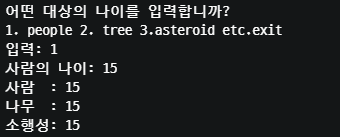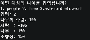 사람뿐 아니라 나무, 소행성의 나이 역시 15가 출력됨을 알 수 있습니다. 이렇게 같은 메모리 영역을 공유한다는 것을 알 수 있습니다. 나무의 수령으로 150을 입력해보겠습니다.