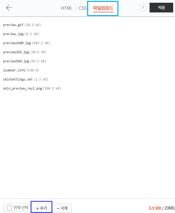 상단 버튼 중에 파일 업로드를 누르고, 하단의 추가 버튼을 누릅니다.