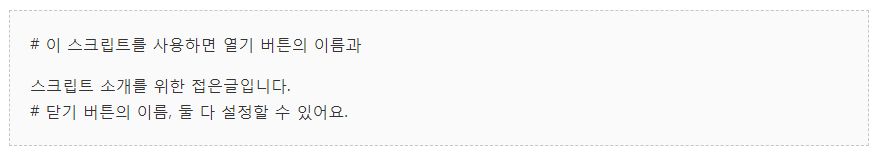 이미지처럼 접은글의 최상단/최하단에 trigger 문자열을 입력하고 뒤에 제목으로 쓸 문장을 입력하면 이 접은글처럼 여닫았을 때 버튼의 텍스트를 변경할 수 있습니다.