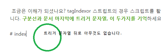 조금은 이해가 되셨나요? tagIndexor 스트립트의 경우 스크립트를 활성화 하는데 그치지 않고 두 개의 트리거가 필요합니다. 구분선과 문서 마지막에 트리거 문자열, 이 두가지를 기억하세요!