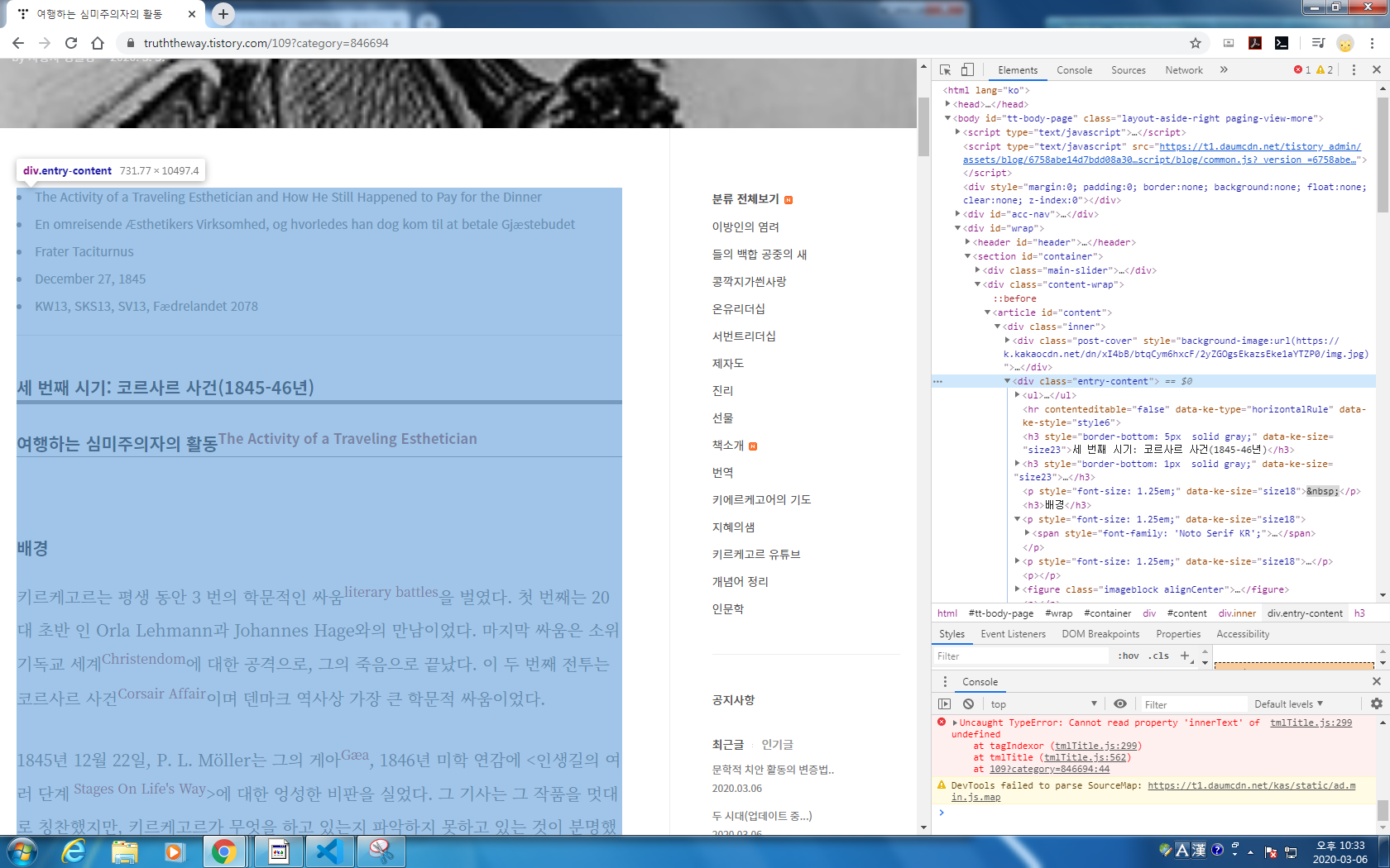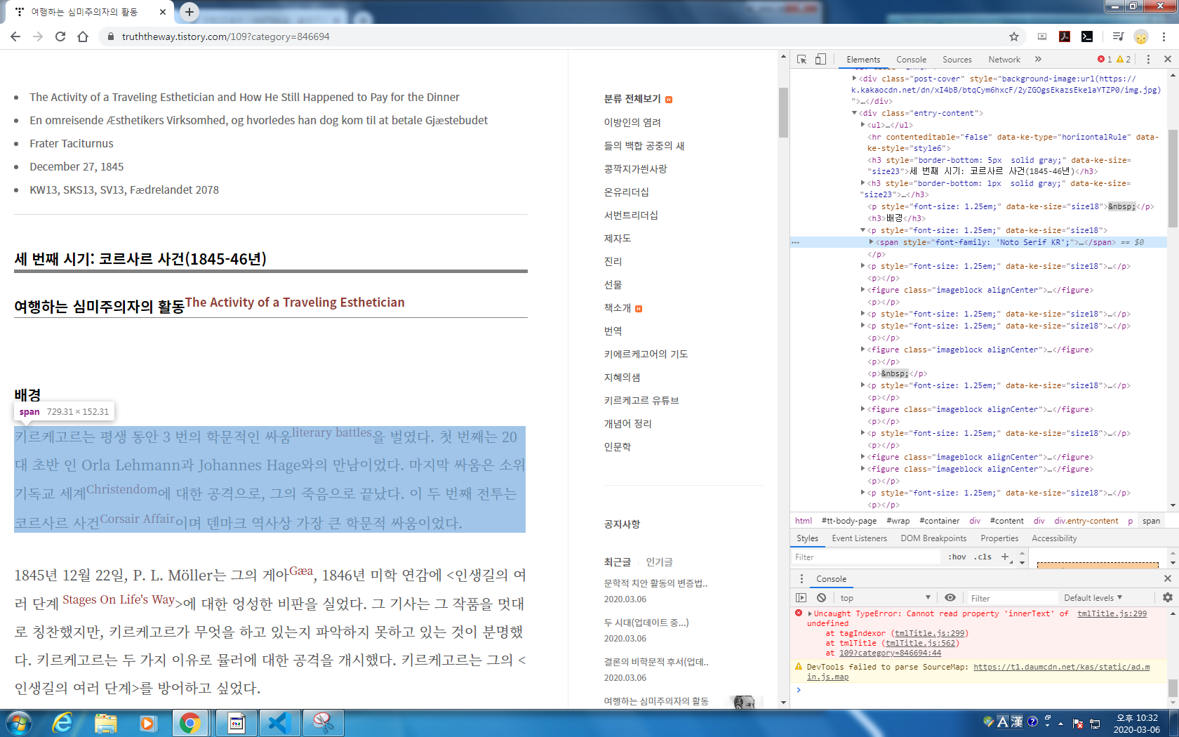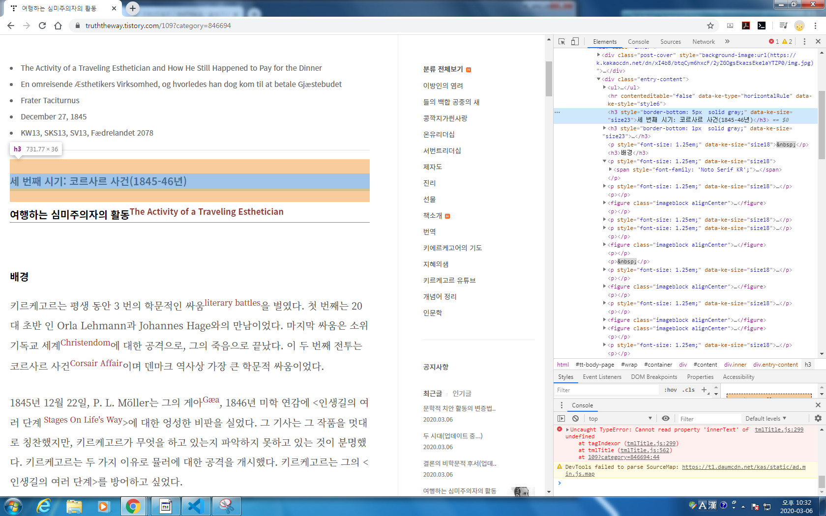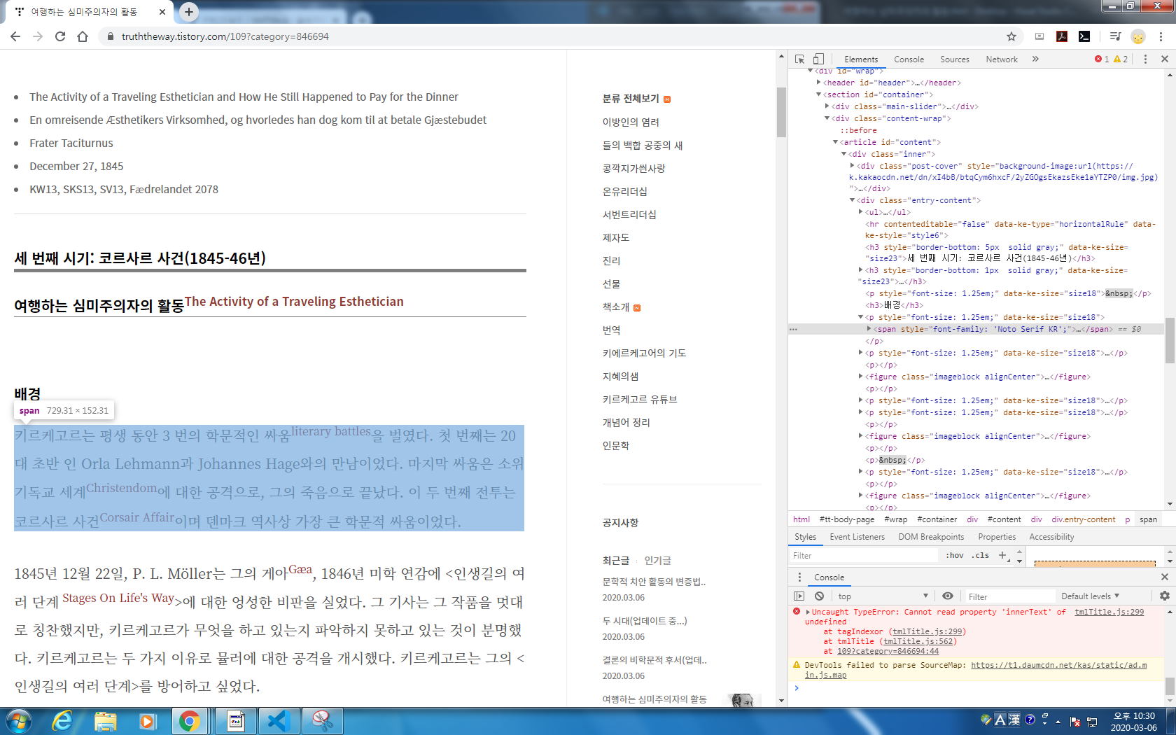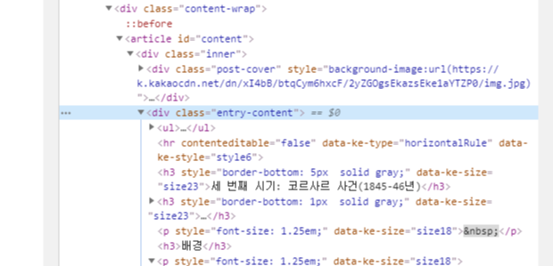 글에서 오른쪽 마우스-검사를 눌러 개발자 도구를 엽니다.