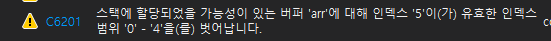 C6201 경고가 함께 발생하는 것을 보니 일차원 배열에 대해서는 스택 범위까지 VS 인텔리센스에서 잡아서 알려줍니다.