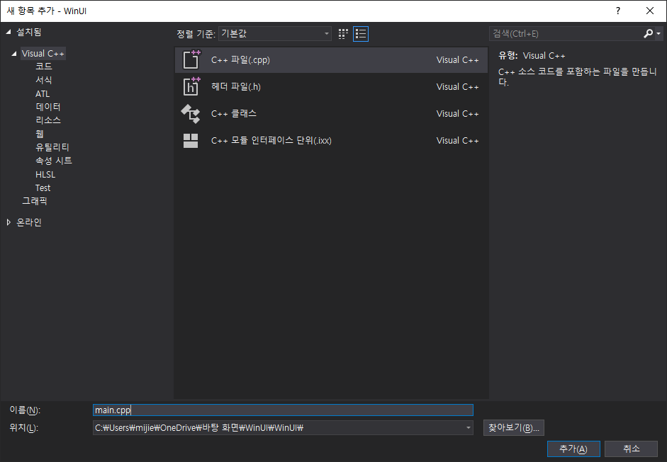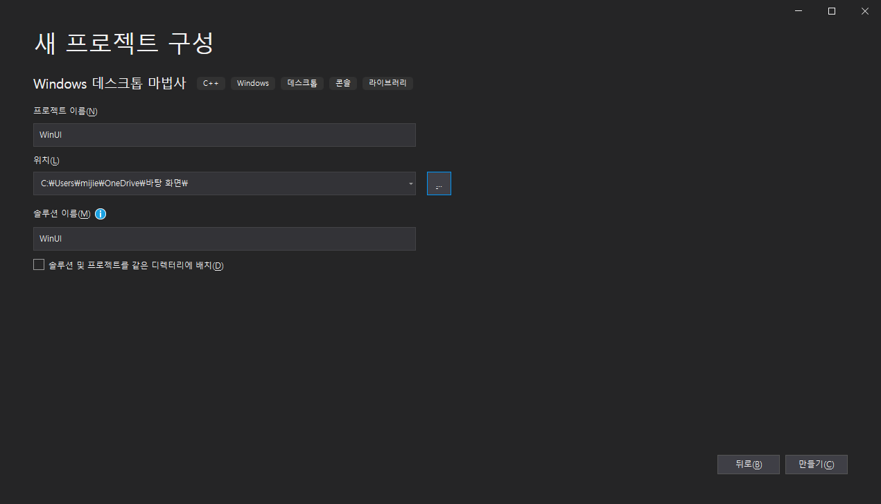 간단히 프로젝트 이름을 생성하고 만들기를 클릭합니다.. 여기에서는 WinUI로 했습니다.