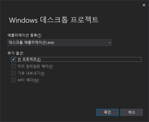 애플리케이션 종류에서 데스크톱 애플리케이셔(.exe)를 선택하고, 추가 옵션에서는 빈 프로젝트를 선택합니다.[# 자질구레한거 싫어하니까]