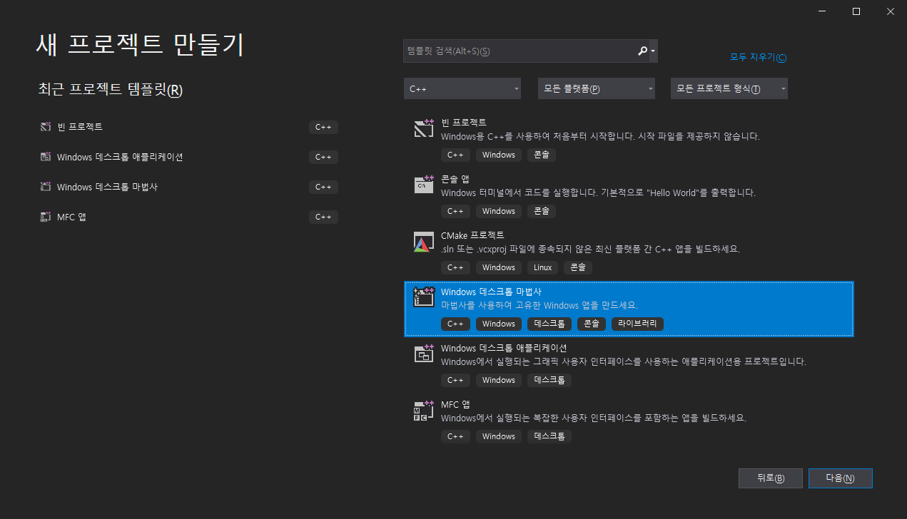 새 프로젝트 만들기에서 데스크톱 마법사를 선택하고 다음을 누릅니다.
