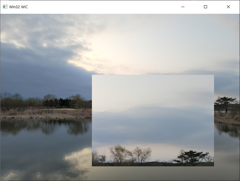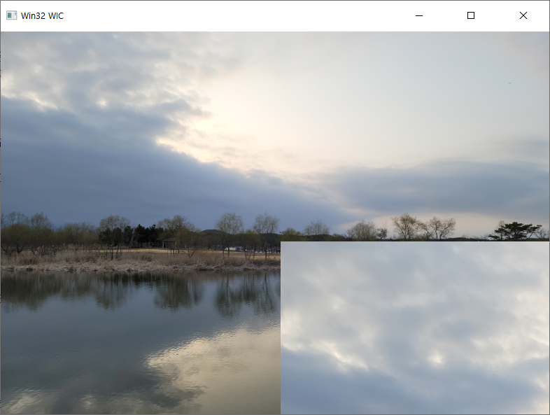 이미지를 변형하면 아래와 같이 나옵니다. 보기의 이미지는 기본 이미지를 출력하고, 그 위에 잘라낸 이미지를 (400, 300) 위치에 크기(400, 300)만큼으로 그린 것입니다.[# 그보다 이미지가 작게 보인다면 윈도우 크기에 의해 잘려진 부분입니다.]