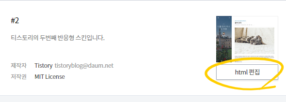 우측 메뉴에서 html 편집 버튼을 클릭해 html 코드를 수정할 수 있는 편집 모드로 이동합니다.