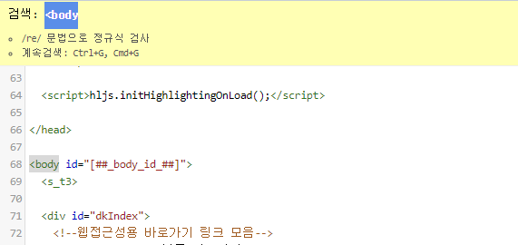 html 편집기에서 body 태그를 찾습니다. 찾기 어려운 경우 편집기가 활성화된 상태[# 키보드 캐럿이 움직이는 상태]에서 Ctrl + F를 통해 검색 기능을 이용할 수 있습니다. <body까지 작성후 엔터 키를 통해 대상을 검색할 수 있습니다.