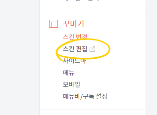 관리자 메뉴에서 꾸미기-스킨 편집을 클릭해 HTML 수정이 가능한 페이지로 이동합니다.