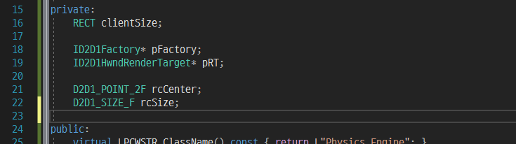 받은 소스파일에서 mainWin.h 파일에 아래와 같이 rcCenter와 rcSize 변수를 생성해줍니다. 이 두 변수로 그리기도 하고 연산도 진행할 것입니다.