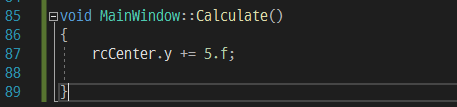 우리가 움직이려 하는 것은 사각형입니다. 이 프로젝트에서 사각형의 위치를 결정짓는 변수는 rcCenter입니다. 이 값의 y값을 계속 더해 윈도우에서 떨어지는 것처럼 만들어보겠습니다.