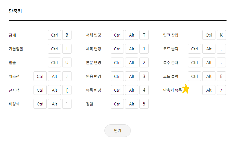 - 단축키 목록을 표시하는 단축키가 표시된 Alt + /과 달리 Ctrl + / 입니다.
