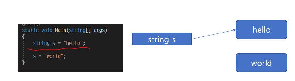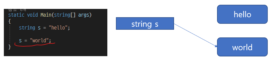 string 자료형은 객체를 변수가 가리키는 방식으로 문자열을 처리하고, 새로운 문자열을 대입했을 때는 객체를 수정하지 않고 새로운 객체를 만들어 해당 객체를 변수가 가리키는 방식으로 처리한다. 즉, C/C++에서의 const char* 타입의 문자열 상수를 가리키는 방식이라 보면 될 것 같다.